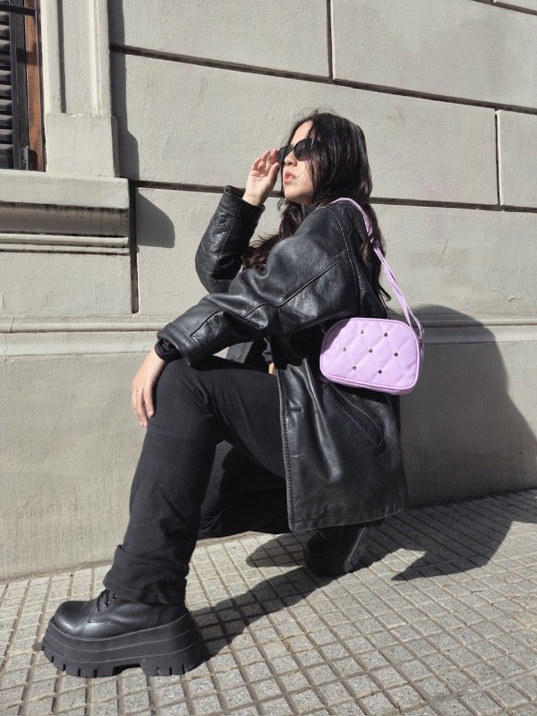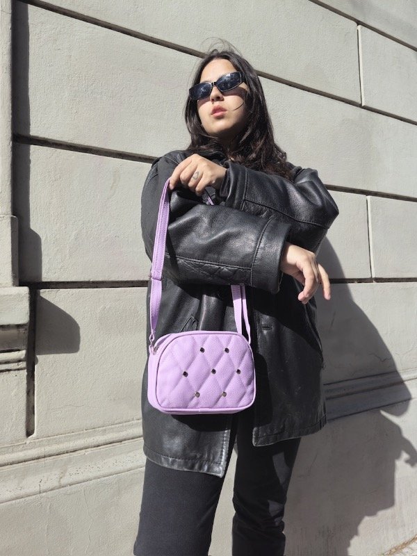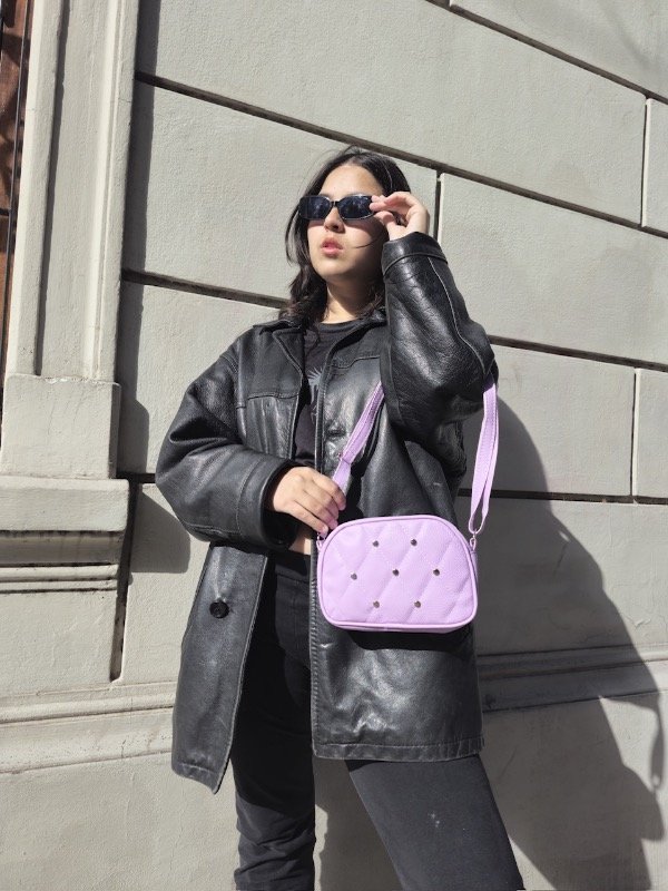 bandolera mini super practica , detalle de tachas, interior forrado.