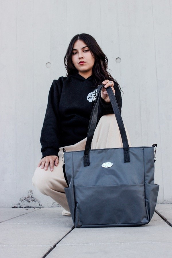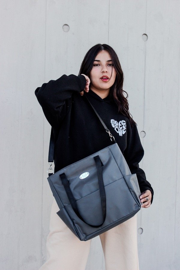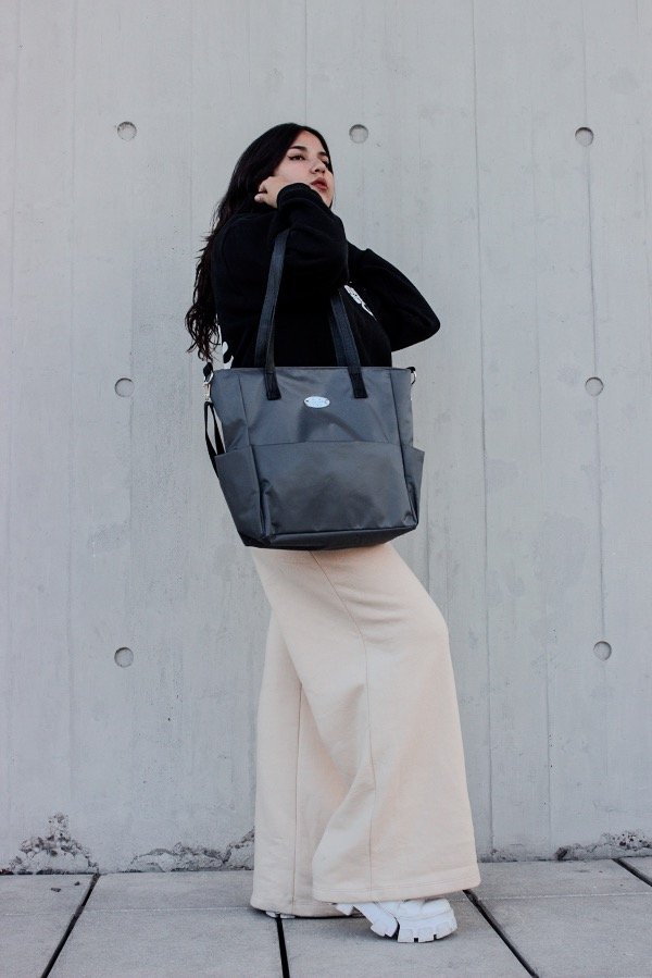 La cartera cuenta con dos manijas cortas de eco cuero para llevar al hombro