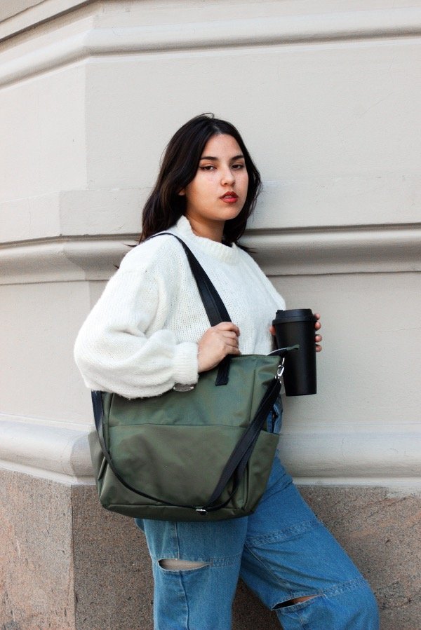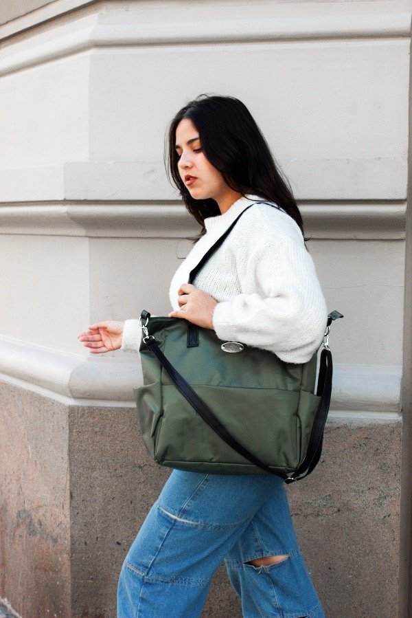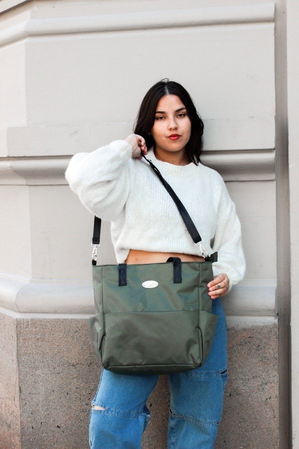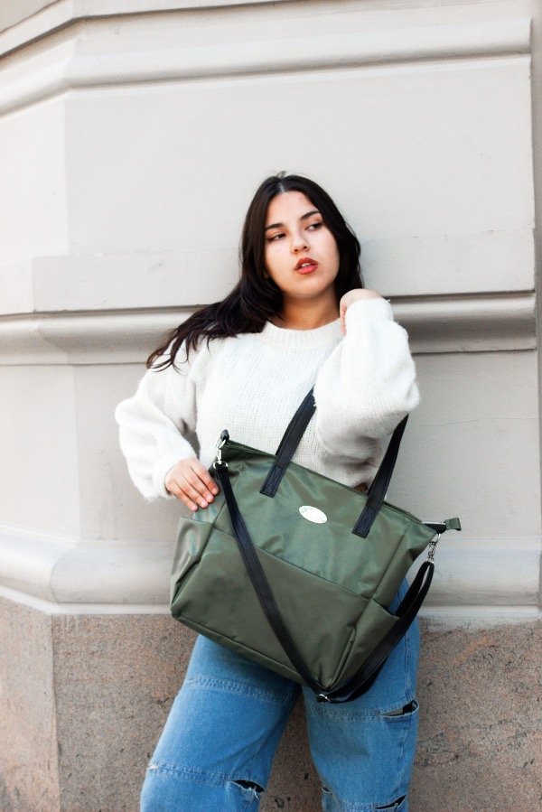 La cartera cuenta con dos manijas cortas de eco cuero para llevar al hombro